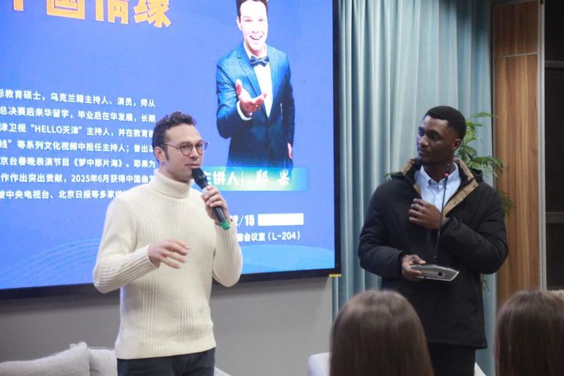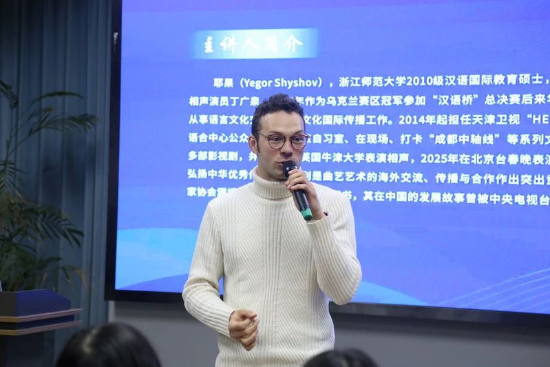2025年12月15日晚,浙江师范大学“丽泽故事汇”第59期活动圆满举行。我校2010级汉语国际教育硕士校友、教育部语合中心国际中文教师奖学金获得者、乌克兰籍主持人兼演员耶果(SHYSHOV IEGOR)重返母校,以“乌克兰小伙的中国情缘”为主题,分享其在华十五年的逐梦历程。浙江师范大学党委学工部副部长杨雪龙、国际处副处长沈立煌、校友办副主任周文忠、国社学院党委副书记陆萍萍,国社学院宣炳善老师出席活动。本期故事汇由国社学院留学生孙华宇主持,80余名中外学子现场聆听。